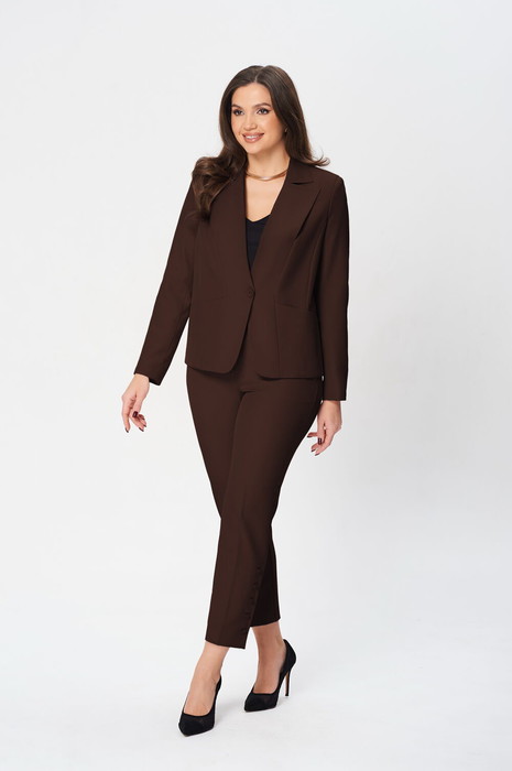 й двухпредметный, состоящий из жакета и брюк. Жакет полуприлегающего силуэта с центральной бортовой застёжкой на одну петлю-пуговицу. Перед с отрезным бочком и рельефным швом, идущим из плечевого шва и до низа. В области груди лацкан входит в рельефный шов. На деталях переда обработаны накладные карманы фигурной формы, расположенные в нижней части изделия между боковым швом и рельефом. Спинка со средним швом. Воротник пиджачного типа. Рукава втачные длинные двухшовные.