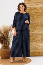 Костюм женский двухпредметный, состоящий из жакета и юбки. Жакет полуприлегающего силуэта с центральной бортовой застежкой на 5 петель-пуговиц. По переду обработаны нагрудные вытачки и по 3 защипа-складки по талии. Спинка со средним швом и двумя защипами-складками с двух сторон. Горловина V-образной формы, с цельнокроенной стойкой и с отрезным швом по спинке. Рукав втачной двухшовный длинный. Юбка заужена к низу, длиной за колено. Переднее полотнище с талиевыми вытачками. Заднее полотнище со средним швом, заканчивающимся шлицей, и с застежкой на потайную тесьму-молнию. Заднее полотнище также с талиевыми вытачками по 2 шт.