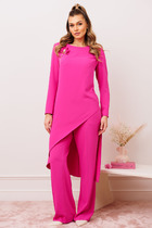 Комплект женский двухпредметный, состоящий из легкой блузы из вуаля и брюк. Блуза свободного кроя с центральной боковой застежкой на тесьму-молнию и двумя накладными карманами. Изделие со слегка спущенной линией плеча. Воротник - стойка. Рукав одношовный втачной длинный. Низ изделия по низу с притачной резинкой. Низ рукава с кулиской на петлю и фиксатор с тонкой резинкой. Брюки с притачным поясом сзади на резинке, классического кроя. Заужены к низу, с боковыми накладными карманами с притачным декором. Брюки с наклонным к боковому шву карманом. Застежка на тесьму-молнию и одну петлю-пуговицу по поясу.