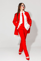 Костюм женский двухпредметный, состоящий из жакета и брюк. Жакет полуприлегающего силуэта на подкладке с центральной бортовой застежкой на 2 декоративные петли-пуговицы. Перед с талиевой вытачкой, отрезным бочком и карманом с листочкой. Борт имеет закругленную форму. Горловина оформлена фигурно с цельнокроенной стойкой по переду и с отрезной по спинке. Спинка со средним швом. Рукава втачные двухшовные с отлетной шлицей, открытой с настрочной декоративной тесьмой, двумя блочками и одной петлей-пуговицей. Брюки классического кроя, слегка зауженные к низу, с притачным поясом сзади на резинке. Застежка на тесьму-молнию и одну петлю-пуговицу по поясу. Карман фигурной формы, с отрезным бочком. На изделии заутюжены стрелки.