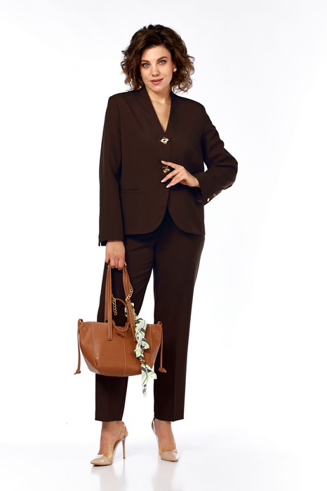 Костюм женский двухпредметный, состоящий из жакета и брюк. Жакет полуприлегающего силуэта на подкладке с центральной бортовой застежкой на 2 декоративные петли-пуговицы. Перед с талиевой вытачкой, отрезным бочком и карманом с листочкой. Борт имеет закругленную форму. Горловина оформлена фигурно с цельнокроенной стойкой по переду и с отрезной по спинке. Спинка со средним швом. Рукава втачные двухшовные с отлетной шлицей, открытой с настрочной декоративной тесьмой, двумя блочками и одной петлей-пуговицей. Брюки классического кроя, слегка зауженные к низу, с притачным поясом сзади на резинке. Застежка на тесьму-молнию и одну петлю-пуговицу по поясу. Карман фигурной формы, с отрезным бочком. На изделии заутюжены стрелки.