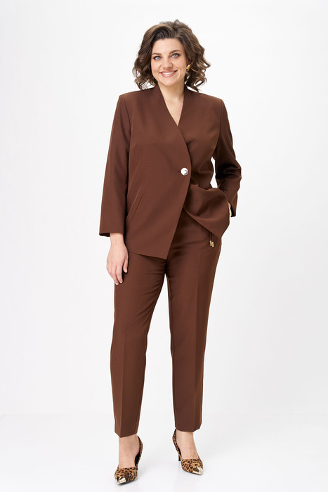 Костюм женский двухпредметный, состоящий из жакета и брюк. Жакет полуприлегающего силуэта со спущенной застежкой на одну декоративную петлю-пуговицу и одну потайную. Перед с отрезным бочком, в котором обработана вытачка, и с карманами с листочкой. Спинка со средним швом. Борт имеет фигурную форму. Горловина - по переду цельнокроенная стойка, а по спинке - отрезная со средним швом. Рукава втачные длинные двухшовные. Брюки классического кроя, зауженные к низу, с притачным поясом, от входа в карман вкруговую с широкой резинкой. Застежка на тесьму-молнию в средних срезах передних половинок и на 2 петли-пуговицы по поясу. Также по поясу вставлен шнурок с фиксатором и наконечниками. Карманы наклонные к боковому шву. На брюках заутюжены канты.