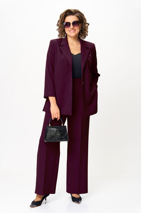 Костюм женский двухпредметный, состоящий из жакета и брюк. Жакет полуприлегающего силуэта, удлиненный, с центральной бортовой застежкой на 2 петли-пуговицы до линии перегиба лацкана. Перед с нагрудными вытачками, выходящими из горловины. Боковые швы с разрезами, между которыми по спинке вставлен пояс фигурной формы с декоратичной нашивкой. Спинка со средним швом. Воротник пиджачного типа. Рукава втачные двухшовные длиной 3/4. Брюки палаццо с притачным широким поясом на резинке от заутюженных стрелок по передней половинке вкруговую. Застежка на тесьму-молнию в средних срезах передних половинок брюк и 2 петли-пуговицы по поясу.