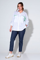 Костюм женский двухпредметный, состоящий из жакета и брюк. Жакет полуприлегающего силуэта, удлиненный, с центральной бортовой застежкой на 2 петли-пуговицы до линии перегиба лацкана. Перед с нагрудными вытачками, выходящими из горловины. Боковые швы с разрезами, между которыми по спинке вставлен пояс фигурной формы с декоратичной нашивкой. Спинка со средним швом. Воротник пиджачного типа. Рукава втачные двухшовные длиной 3/4. Брюки палаццо с притачным широким поясом на резинке от заутюженных стрелок по передней половинке вкруговую. Застежка на тесьму-молнию в средних срезах передних половинок брюк и 2 петли-пуговицы по поясу.