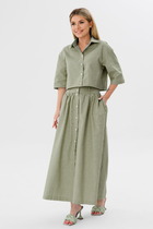 Комплект женский, состоящий из туники и брюк. Туника А-образного силуэта с центральной застежкой на планку до подреза на 3 декоративные петли-пуговицы. Перед с нагрудной вытачкой и фигурными подрезами. Спинка с горизонтальной кокеткой и двумя складками. В боковых швах обработаны разрезы. Низ переда ассиметричен и слегка разведен. Рукава втачные одношовные длиной 3/4 с защипом, имитирующим манжет. Воротник-стойка. Брюки классического кроя, зауженные к низу с притачным поясом сзади на резинке. Застежка на тесьму-молнию в среднем шве передних половинок и 1 петлю-пуговицу по поясу. На брюках заутюжены канты.
