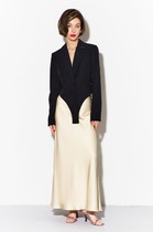 Костюм женский двухпредметный, состоящий из жакета и брюк. Жакет полуприлегающего силуэта с центральной бортовой застежкой на тесьму-молнию, с фигурными бочками. Спинка со средним швом. Вырез горловины V-образной формы. Рукава втачные длинные двухшовные. Брюки-палацо с притачным поясом, сзади на резинке. Застежка на тесьму-молнию в средних срезах передних половинок брюк и 1 петлю-пуговицу. В изделии обработаны карманы, наклонные к боковому шву. На брюках заутюжены стрелки.
