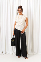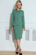 Костюм женский двухпредметный, состоящий из жакета и брюк. Жакет полуприлегающего силуэта с центральной бортовой застёжкой на две петли-пуговицы и подрезом фигурным от бокового шва, переходящим в нагрудную вытачку. В подрезе обработан карман с листочкой. Спинка со средним швом. Воротник фантазийной формы - в виде подреза, переходящего в стойку. Рукава втачные, двухшовные. Брюки с притачным поясом, по задним половинкам вставлена резинка. Застёжка на тесьму-молнию в среднем срезе и одну петлю-пуговицу по поясу. Брюки слегка зауженные к низу с наклонным карманом из бокового шва и заутюженными стрелками. Длина жакета по спинке - 67,5 см. Длина рукава - 61 см. Длина брюк по боковой части - 99 см.