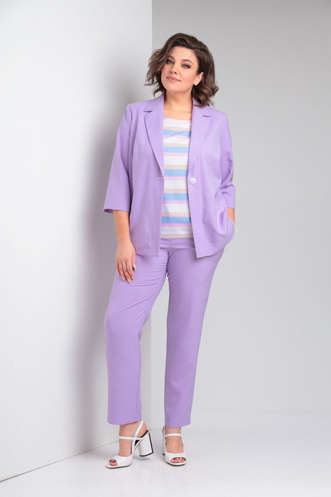 Костюм женский трёхпредметный, состоящий из жакета, брюк и блузы. Жакет полуприлегающего силуэта без подкладки с центральной бортовой застёжкой на 1 петлю-пуговицу. Перед с отрезным бочком, в котором обработаны нагрудные вытачки и боковой карман "в шве". Спинка со средним швом. Рукав одношовный втачной прямой длиной 3/4. Воротник пиджачного типа. По борту и мешковине кармана, низу изделия и рукава проложена отделочная строчка контрастного цвета. Брюки слегка зауженные к низу на притачном поясе, концы которого застёгиваются на обмётанную петлю и пуговицу, с застёжкой на тесьму-молнию спереди. Передние половинки брюк с боковыми карманами. По поясу задних половинок вставлена эластичная тесьма "резинка". Края пояса, низ изделия, гульфик и срез кармана отстрочены контрастной отделочной строчкой. Блузка женская из принтованной ткани полуприлегающего силуэта со слегка спущенной линией проймы. Горловина овальной формы. Длина жакета по спинке - 65,5 см. Длина рукава жакета - 46 см. Длина брюк по боковому шву - 99,5 см.