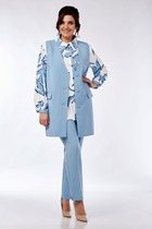 Костюм женский двухпредметный, состоящий из укороченного жакета на подкладке и брюк. Жакет с центральной бортовой застёжкой на две петли-пуговицы до линии перегиба лацкана прямого силуэта с нагрудной вытачкой, выходящей из бокового шва и резинкой по низу переда и частично по спинке. На спинке настрочен декоративный эменет. Рукава втачные длинные одношовные. Воротник пиджачного типа. Брюки классического кроя прямого силуэта со стрелками и притачным поясом на широкой резинке. Застёжка на потайную тесьму-молнию в боковых швах. На поясе настрочены шлёвки для съёмного пояса, застёгивающегося на 1 петлю-пуговицу. В брюках обработаны карманы, наклонные к боковому шву. Длина жакета по спинке - 49 см. Длина рукава - 60,5 см. Длина брюк - 100 см.