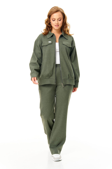 Бомбер прямого свободного покроя со спущенной линией плеча на подкладке. По переду обработаны кокетки с клапанами и прорезные карманы с листочкой. Застежка центральная бортовая на металлическую тесьму молнию. На спинке обработана отрезная кокетка. По низу бомбера притачной пояс. На спинке и переде в шве притачивания пояса, заложены лёгкие односторонние складки. Воротник отложной. Рукав рубашечного покроя, полноценной длины. Низ рукава обработан притачной манжетой с застежкой на кнопку. На одном из клапанов имеется декоративная нашивка.