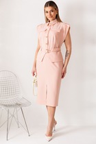 Комплект состоит из топа и брюк. Топ прямого силуэта с естественной линией плеча. По переду выполнены нагрудные вытачки.Горловина округлой формы. В горловине спинки выполнен вырез "капля" с застёжкой на навесную петлю и пуговицу.Верхний слой топа выполнен из полотна с "ресничками". Нижний слой топа - из трикотажной подкладки.Рукав длиной до линии локтя. Брюки расширенные к низу типа "палаццо" с центральной застёжкой на молнию и петлю-пуговицу. В боковых швах карманы с отрезным бочком.Пояс притачной с резинкой по задней части пояса. В комплект входит съёмный цветок с перьями контрастного цвета.