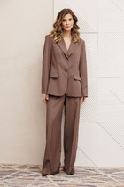 Брюки свободные прямого силуэта. Пояс притачной с резинкой по бокам. Передние половинки с карманами с отрезным бочком и односторонними складками. Застежка на тесьму-молнию и пуговицу.