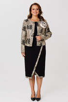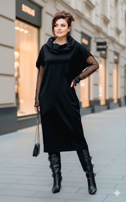 Комплект женский состоящий из платья и блузона. Платье свободного силуэта заужается к низу. Горловина округлой формы, с притачным воротником по форме «хамут» с декоративными защипа, создающими оригинальную форму, из отделочной ткани. По переду платья отрезная кокетка, геометрические подрезы с вставками из отделочной ткани. Сочетание разных фактур ткани чёрного цвета создаёт стильный образ на каждый день. Спинка в платье со средним швом. В боковых швах платья карманы.