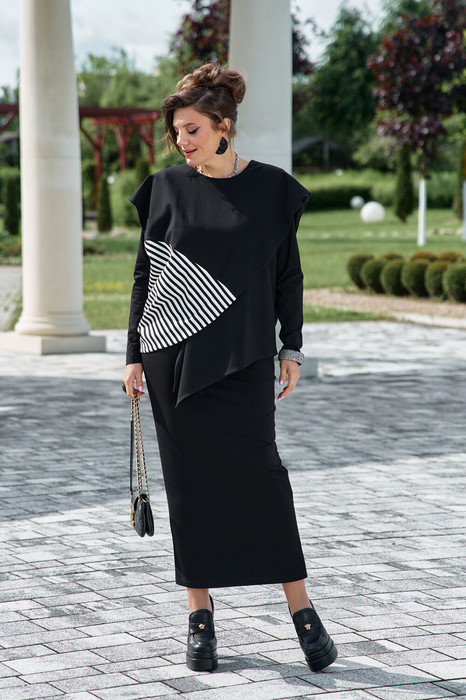 Комплект женский, состоящий из джемпера и платья.  Асимметричный джемпер, объемный, его оверсайз-силуэт делает образ дерзким и одновременно изысканным. Горловина округлой формы, линия плеча спущена, линия проймы углублённая. По переду джемпера декоративная отлетная складка, фигурный подрез со вставкой из отделочной ткани в полоску преходящая на спинку. Низ завершает отлетная деталь — неструктурированный волан, который живет своей жизнью, колышется при каждом шаге, добавляя динамики и легкости массивному верху. Он не пришит намертво, он «отлетает», создавая ощущение незавершенности и художественного хаоса. Спинка в джемпере с застёжкой на декоративную тесьму молнию в среднем шве, декоративным подрезом. Низ спинки джемпера фигурной формы. Платье  прилегающего силуэта, длины миди. Горловина округлой формы. Рукав в платье втачной. Спинка без особенностей. Длина миди и длинные рукава платья создают изящный и лаконичный силуэт.Длина платья 121 см (р.50-54), 121,5 см (р.56-60), длина рукава платья 64 см. Длина джемпера 55 см, длина по плечу 24,5 см (р.50-56), 26,5 см (р.56-60).