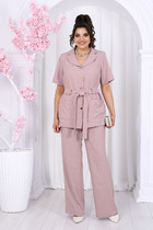 Костюм женский, состоящий из блузки и брюк-кюлот. Блузка свободного силуэта. Горловина округлой формы с отложным воротником на стойке фигурной формы переходящим на спинку из отделочной ткани. По спинке вырез капелька с застёжкой на пуговицу, спинка со средним швом. Рукав цельнокроены с со сборкой на притачной манжет по низу. Боковой шов слегка переходит на перёд. Низ в блузке ассиметричный с разрезами в боковых швах. Брюки-кюлоты свободного силуэта, длиной 7/8 расширяются к низу. Пояс притачной со вставкой эластичной тесьмы-резинки, которая обеспечивает максимально удобную посадку на любой тип фигуры. По переду брюк от верха застрачиваются складки. В задней части брюк застёжка на тесьму-молнию в шве и пуговицу в поясе. В боковых швах брюк- карманы.