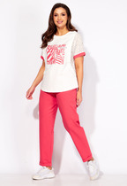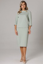 Блузка свободного силуэта, удлинённая, с центральной застёжкой на молнию по центру переда, воротником рубашечного типа. По переду блузки ассиметричные отлетные планки, декоративные накладные карманы с клапаном с фигурным входом в карман, а так же декоративная функциональная планка от головины. По спинке блузки отрезная кокетка с вертикальными декоративными рельефами, отлетной планкой. Линия плеча спущенная. Рукав втачной, длинный с декоративным локтевым швом, заложенной складкой по низу и притачной манжетой по низу. В боковых швах блузки разрезы. Брюки прямого силуэта, по переду застежка на тесьму молнию в гульфике и пуговицу в поясе. По переду брюк наклонные карманы. Пояс притачной со шлёвками, вставкой эластичной тесьмы резинки в «бочках» пояса и вставкой фигурной кокетки по задним деталям брюк. По задним половинкам брюк накладные карманы. Текстура денима с легкой потертостью. Длина блузки 75 см (р 50-54), 75,5 см (р 56-60). Длина рукава 74 см (р 50-54), 75,5 см (р 56-60) см. Длина брюк по боковому шву 98 см.