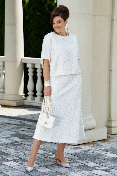 Костюм женский, состоящий из блузона и юбки. Безумно красивый и стильный костюм в стиле "шанель". Стильный костюм с юбкой "миди" создан в духе последних тенденций. Блузон свободного силуэта, укороченный. Горловина округлой формы. По переду и спинке блузона вертикальные рельефы. Рукав цельнокроеный с фигурной линией низа. По спинке блузона застёжка на декоративную тесьму-молнию. Низ в блузоне ассиметричный. Юбка расклешенная длины миди с притачным поясом со вставкой эластичной тесьмы-резинки в бочках. По переднему полотнищу юбки прорезные карманы с листочкой. По спинке юбки застёжка на потайную молнию и пуговицу в поясе. Юбка на подкладке, Обращаем Ваше внимание что фурнитура может незначительно отличаться от фото.