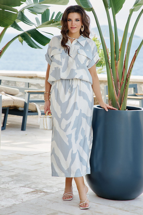 Костюм женский, состоящий из блузы и юбки длины «миди», восхитительно смотрится на фигуре, подчеркивая ваши формы и скрывая недостатки. Идеально подойдёт на жаркую летнюю погоду как для повседневной носки, так и для непринужденных прогулок на отдыхе. Данная модель — это сочетание гармонии и утончённой элегантности, заключённая в простоте линий. Блуза, свободного силуэта, словно окутывает своим мягким касанием, обеспечивая свободу и комфорт. По центру переда застёжка на тесьму молнию; воротник рубашечного типа, который придаёт образу дерзкую нотку, добавляя акцент на современность и практичность. По переду блузки накладные карманы с клапаном. Линия плеча спущенная с отложной манжетой по низу. Спинка со средним швом. По низу блузы сборка на эластичную тесьму резинку.  Юбка прямого силуэта, длины «миди», с притачным поясом на резинке, что обеспечивает максимально удобную посадку на фигуру, кулисой с декоративным шнуром из основной ткани. В боковых швах от низа высокие разрезы. Обращаем Ваше внимание, что фурнитура может незначительно отличаться от фото. Длина блузки 64 см (р 50-54), 65,5 см (р 56-60), длина рукава 32 см (р 50-54), 34 см (р 56-60). Длина юбки 89 см.