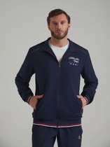 Костюм мужской из ткани высокого качества. Кофта на молнии, ворот-стойка, рукава-реглан. Рукава на манжете, сбоку по рукаву до локтя цветная вставка с печатью. Спереди на кофте два кармана на молнии. Слева на груди печать-надпись. Брюки на манжете. Спереди два кармана на молнии, один сзади без молнии. Сбоку на брюках до колена цветная вставка с печатью.