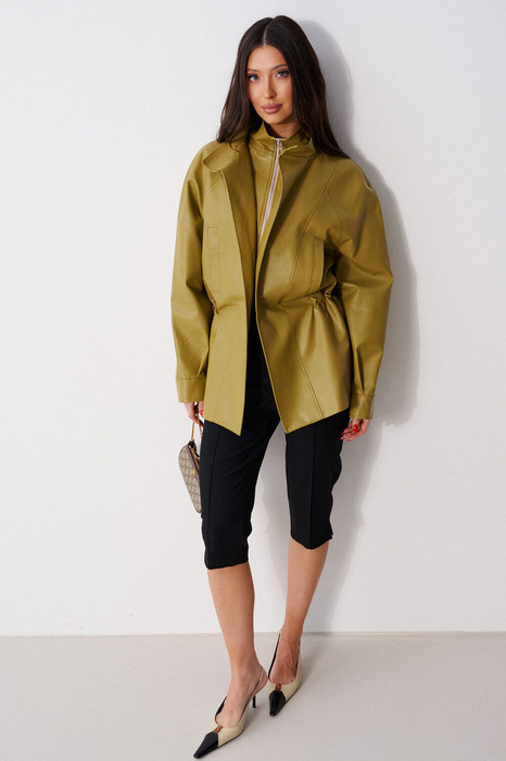 Куртка свободного кроя. Выполнена из эко-кожи оливкового цвета. С подкладкой. Воротник-стойка. Рукав реглан, с манжетом. Внутренняя часть изделия - манишка с центральной застёжкой - молнией. Основная часть изделия с прорезными карманами с листочкой. По линии талии - резинка, с кулиской, с фиксаторами. Длина рукава от горловины 79 см. Длина спинки 73 см.