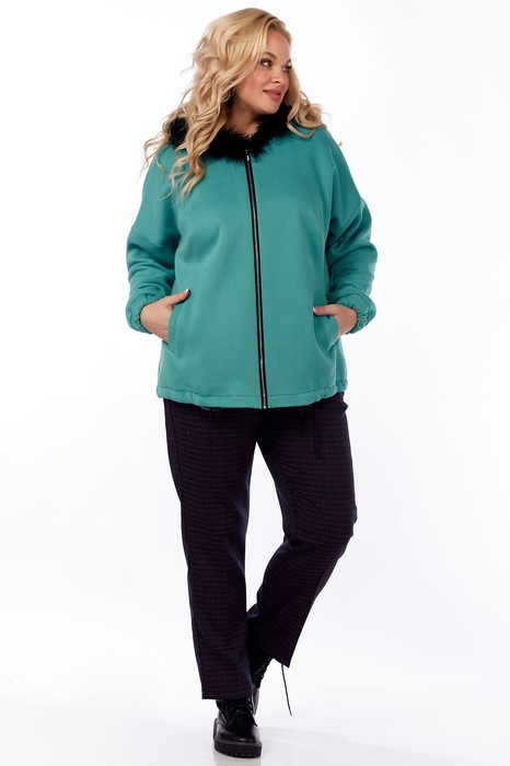 Джемпер женский свободного силуэта из трикотажной ткани на флисе, без подкладки, с функциональными карманами по переду, застежка молния, по низу изделия кулиска со шнурком, капюшон украшен боа. Длина джемпера 60 см.