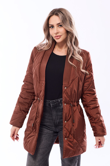 Куртка утепленная, с центральной застежкой на кнопки, втачным воротником, V-образным вырезом горловины. На полочках расположены прорезные карманы с листочками. На линии талии расположена кулиса со шнуром. Толщина синтепона 150г/м2, , изделие рекомендуется до -5 градусов.