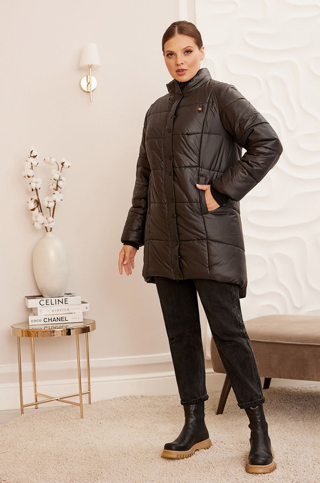 Куртка на стойке с застежкой на металлическую молнию (с двумя бегунками), молния закрыта вертикальной планкой с металлическими кнопками. Перед с вертикальными рельефами, в рельефах выполнены карманы с листочками. Спинка чуть длиннее переда, с кокеткой и средним швом, по центру кокетки пришито декоративное украшение. Рукава втачные, свободные (внутри на притачной манжете из вязанного трикотажа).