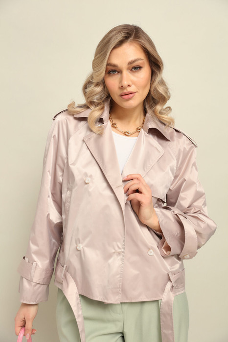 Лёгкая куртка-тренч свободного объёма прямого силуэта с застёжкой на пуговицы. Пояс съемный, продевающийся через шлевки.