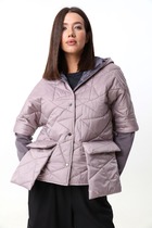Укороченная куртка с капюшоном и застежкой на кнопки. Рукава куртки состоят из двух видов ткани. По переду куртка дополнена накладными карманами с клапаном , выходящими за пределы длины куртки.