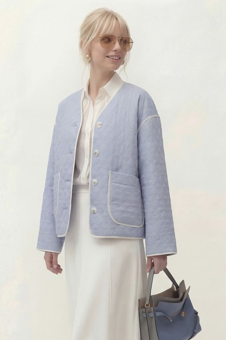 Куртка свободного кроя, облегченная, без подкладки и синтепона.  Линия плеча спущена, рукав длинный. V-образный вырез горловины. Застежка однобортная на петли и пуговицы. По бокам накладные карманы. По спинке средний шов. Шов втачивания рукава, низ рукава, горловина, борт, карман, средний шов спинки обработан окантовкой из отделочной ткани.
