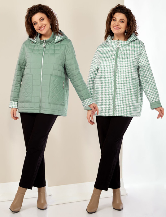 По переду, однотонной стороны изделия, стёжка квадратами и функциональные, накладные карманы на молнии. Капюшон съемный на пуговицах, регулируется при помощи кулиски. Рукав втачной, двухшовный, длина регулируется с помощью отворота.