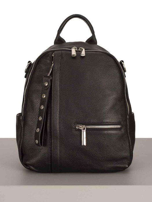 Рюкзак женский выполнен из натуральной кожи. Детали: 2 укреплённые стропой регулируемые ручки на плечо до 85см. Внутри изделия: 1 отделение на молнии, 1 евро карман, 1 открытый карман, 1 карман на молнии. Брендированная подкладка из хлопка. Снаружи изделия: 1 карман на молнии на оборотней стороне изделия, 2 кармана на молнии спереди изделия, 2 открытых кармана по бокам изделия. Металлическая брендированная фурнитура серебристого цвета. В комплекте фирменный пыльник.