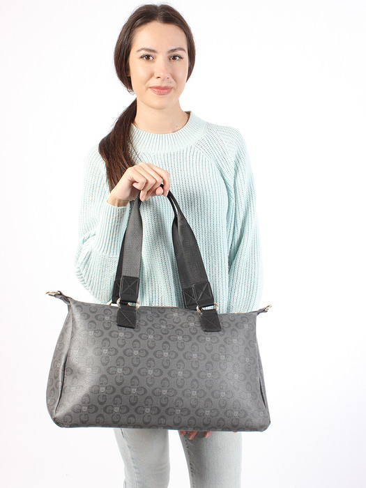 Сумка выполнена из экокожи канва. Детали: 2 ручки по 60см., 1 длинный регулируемый ремень на карабинах. Внутри изделия: 1 отделение на молнии, 1 карман на молнии, 1 карман открытый. Снаружи изделия: 1 карман на молнии с оборотной стороны изделия. Брендированная подкладка из хлопка. Металлическая брендированная фурнитура золотистого цвета.