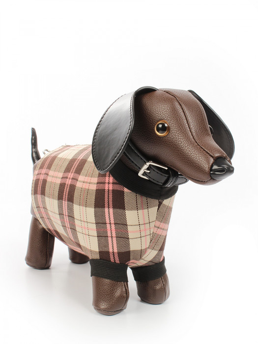 Сумка в виде таксы выполнена из экокожи. Детали: 1 отстегивающаяся ручка от 110 см до 125 см. Внутри изделия: 1 отделение на молнии. Брендированная подкладка из хлопка. Металлическая брендированная фурнитура серебристого цвета. В комплекте фирменный пыльник для хранения сумки.