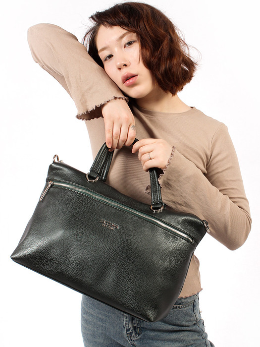 Сумка женская выполнена из экокожи. Детали: 2 короткие ручки по 36 см, 1 длинный ремешок на плечо 130 см. Внутри изделия: 1 отделение на молнии, 1 карман для документов на молнии, 1 открытый карман, 1 карман для мобильного телефона и 1 карман на молнии. Снаружи изделия: 1 карман на оборотной стороне на молнии и 1 большой карман спереди изделия. Брендированная подкладка из хлопка. Металлическая брендированная фурнитура серебристого цвета. В комплекте фирменный пыльник.