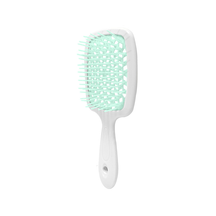 Широкое расположение мягких, закругленных щетинок создает идеальные условия для бережного расчесывания. Они проникают в волосы, охватывая более обширные участки, что позволяет расчесывать даже влажные пряди без риска их повреждения или вытягивания. Это делает её идеальным выбором для использования после мытья, на влажных волосах, когда они наиболее уязвимы.
