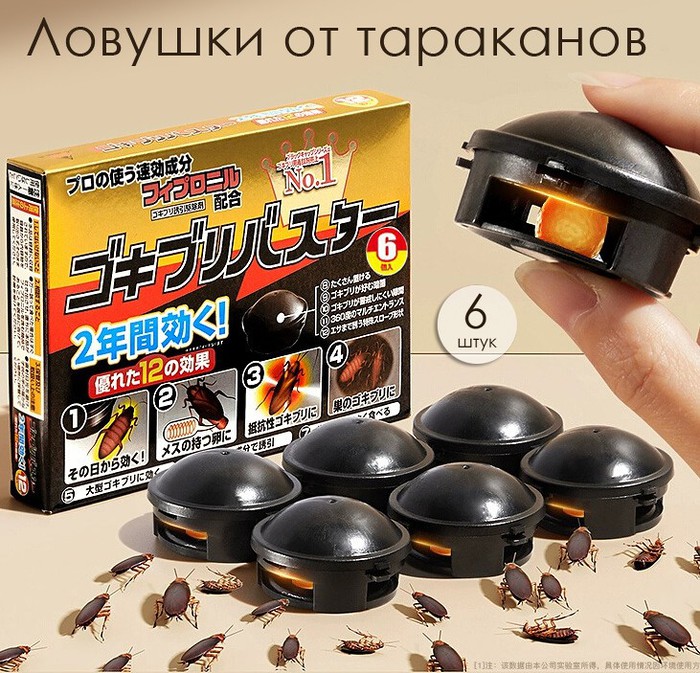 Ловушки от тараканов - сильное, эффективное, простое в использовании средство в виде черных дисковых ловушек с ядовитой приманкой внутри, вызывающее эпидемию у колоний тараканов.Средство массового уничтожения тараканов в доме работает по принципу цепной реакции: тараканы, попадая в ловушку, съедают приманку, содержащую инсектицид и разносят ее своим сородичам. Через время вся популяция тараканов начинает гибнуть.Препарат внутри ловушки не имеет запаха, поэтому ловушки можно использовать рядом с посудой и продуктами. Также он не вызывает привыкания у насекомых.Оптимальный дизайн ловушки с липучками позволяет располагать ее практически на любых (горизонтальных и вертикальных) поверхностях. Длительность действия до 2-х месяцев., Способ применения: Распакуйте ловушки и разделите. Для получения необходимого эффекта лучше использовать сразу все диски. Установите ловушки в тех местах, где чаще всего наблюдается скопление тараканов. Хорошим местом станут углы и зоны возле стен. Для крепления ловушек используйте липкий стикер на тыльной стороне. При низкой численности насекомых используйте 2-3 контейнера и 4-6 при высокой насыщенности — на площадь 10 кв.м. Для большей эффективности используйте все 6 дисков одновременно. Меняйте ловушки каждые два месяца, что бы обеспечить защиту от попадания насекомых от соседей в ваш дом уже после уничтожения., Не применяйте аэрозольные препараты в непосредственной близости от ловушек. Это может отпугнуть тараканов.