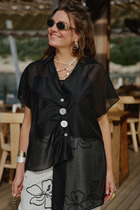 Укороченная женская блузка А-образного силуэта из хлопкового поплина – плотного текстильного полотна, которое отлично держит форму. Сзади блузка застегивается на пуговицы. Рукава широкие и прямые, длиной до локтя. Линия плеча удлиненная, с необычной складочкой. Идеально решение для ваших стильных образов!