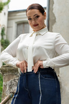 Блузка женская свободного силуэта из ткани. Блузка с цельнокроеной планкой и центральной застежкой на пуговицы. На левой детали переда накладной карман.