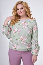 Блузка прямого силуэта. Горловина V-образной формы. Центральная застежка на завязки. Борта обработаны подбортами. Рукава втачные длинные, свободные. Плечо спущено. Нижний срез блузки и рукавов обработан швом вподгибку.