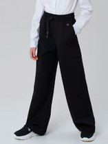 Брюки свободного силуэта с высокой посадкой. Пояс цельнокроенный с эластичной тесьмой внутри 30RV. По поясу сделаны 2 отделочные строчки. Боковые швы перенесены вперед. Карманы в боковых швах. Низ с открытым срезом. По низу сделана отделочная строчка.