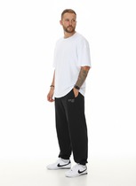 Брюки прямые, свободные. Пояс отрезной с эластичной тесьмой внутри. С внешней стороны пояса пробиты петли и втянут шнур (8КXW-1 8мм) с узлом на концах. В боковых швах обработаны карманы, подкладка кармана из основного полотна. На левой передней половинке проложена декоративная строчка - имитация гульфика. На задней правой половинке накладной карман. Нижние срезы брюк обработаны швом вподгибку с эластичной тесьмой внутри.