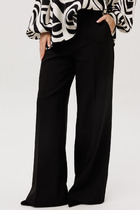 Брюки прямого силуэта зауженные к низу. Пояс отрезной. Задняя часть пояса присборена на эластичную тесьму. По поясу настрочены шлевки. На деталях переда обработана имитация карманов. На правой передней половинке отстрочена декоративная строчка - имитация гульфика. В боковом шве застежка на потайную молнию. На задних половинках в районе колен декоративные горизонтальные подрезы. Нижние срезы брюк обработаны швом вподгибку на 2х игольной плоскошовной машине.