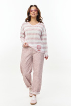 Брюки прямые, свободного силуэта. Посадка средняя, сиденье опущено. Пояс цельнокроеный с эластичной тесьмой внутри (вн. 20мм 20RV). В боковых швах обработаны карманы. Подкладка кармана из основного полотна. Нижние срезы обработаны швом вподгибку.