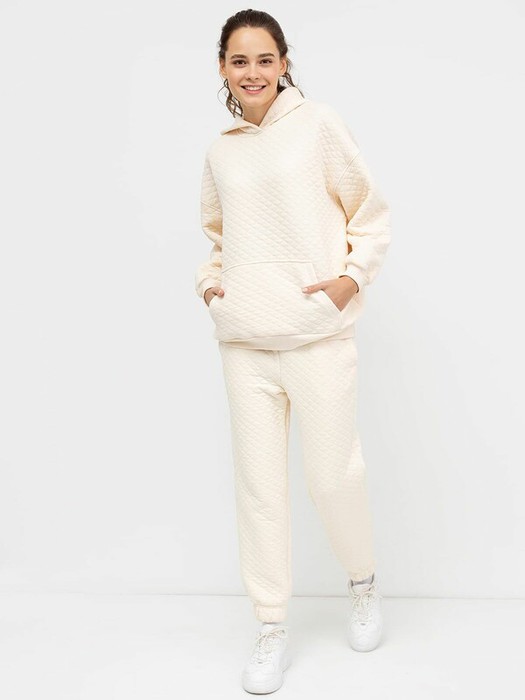 Ультрамодные женские брюки из капитона – трикотажного полотна с необычной "стеганой" фактурой. Силуэт брюки свободный, оверсайз. Пояс с эластичной тесьмой внутри. В боковых швах есть карманы. Штанины завершаются манжетами с эластичной тесьмой. Красиво и удобно!