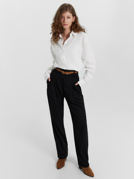 Брюки женские прямого силуэта из ткани. Пояс отрезной из основного полотна. На поясе обработаны шлевки.