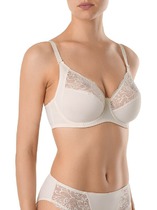 Чашки бюстгальтера выполнены из кружева на мягкой сетчатой подкладке. Они имеют специальные конструктивные швы, которые помогают лучше повторить форму груди для идеальной посадки. Бретели регулируются по длине, что позволяет индивидуально подобрать нужный уровень поддержки. Широкая двойная застежка на спине надежно фиксирует модель, а вся окантовка чашек, бочков и низа выполнена мягкой эластичной тесьмой, которая предотвращает натирание и делает бюстгальтер неощутимым под одеждой.