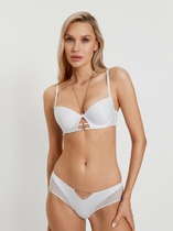 Надежная многоточечная застежка позволяет точно настроить посадку. Изящный декоративный элемент из тонкой тесьмы, протянутый через кольца бретелек и ластовицу, добавляет модели элегантности и завершенности.