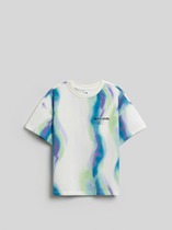 Футболка прямого силуэта. Перед и спинка цельнокроенные. Горловина круглой формы, широкая обтачка из рибаны. Рукав втачной, широкий. Футболка слегка укорочена. Подгибки низа и рукава широкие.