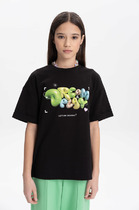 Футболка прямого силуэта. Перед и спинка цельнокроенные. Горловина круглой формы, широкая бейка из рибаны. Рукав втачной, широкий. Футболка слегка укорочена. Подгибки низа и рукава широкие.